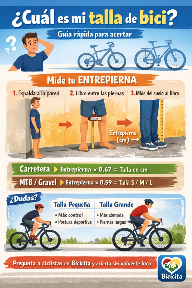 2) Método rápido (2 minutos) para saber tu talla base Necesitas: pared, libro, cinta métrica. Paso A — Mide tu entrepierna Descalzo/a, espalda contra la pared. Coloca un libro entre las piernas, arriba, como si fuese un sillín. Mide desde el suelo hasta la parte superior del libro. 👉 Ese número (en cm) es tu entrepierna. Paso B — Calcula una talla aproximada (punto de partida) Carretera (talla de cuadro en cm): Entrepierna × 0,67 MTB/Gravel (talla más orientativa): Entrepierna × 0,59 (aprox. en cm) Ojo: en MTB y gravel casi siempre se usa S/M/L o números que cambian según marca. Esto NO es matemáticas exactas. Es para reducir opciones.